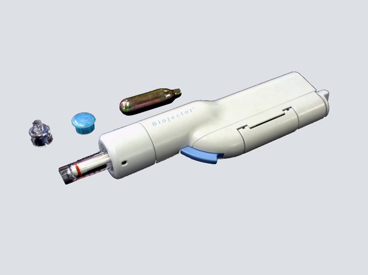The Biojector injection device is a needle-free system that uses a C02 cartidge to force the vial’s fluids into the skin.  All of our vials are empty of course for filming purposes, but the visual of the plunger being pushed towards the skin is the same, but safe for the actor