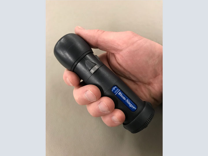 Battery Operated digital speech aid by Blom-Singer.  Approx 5″ x 1.5″